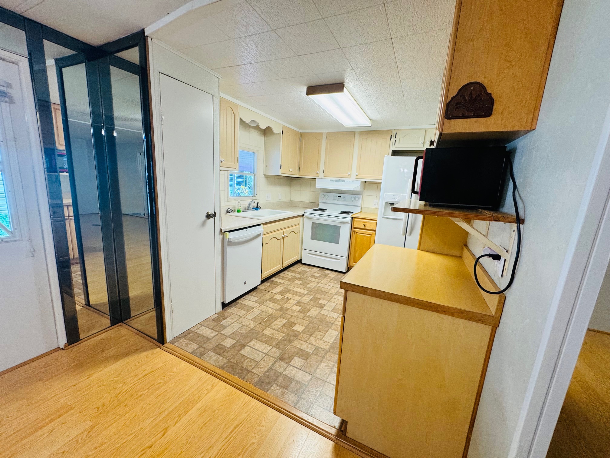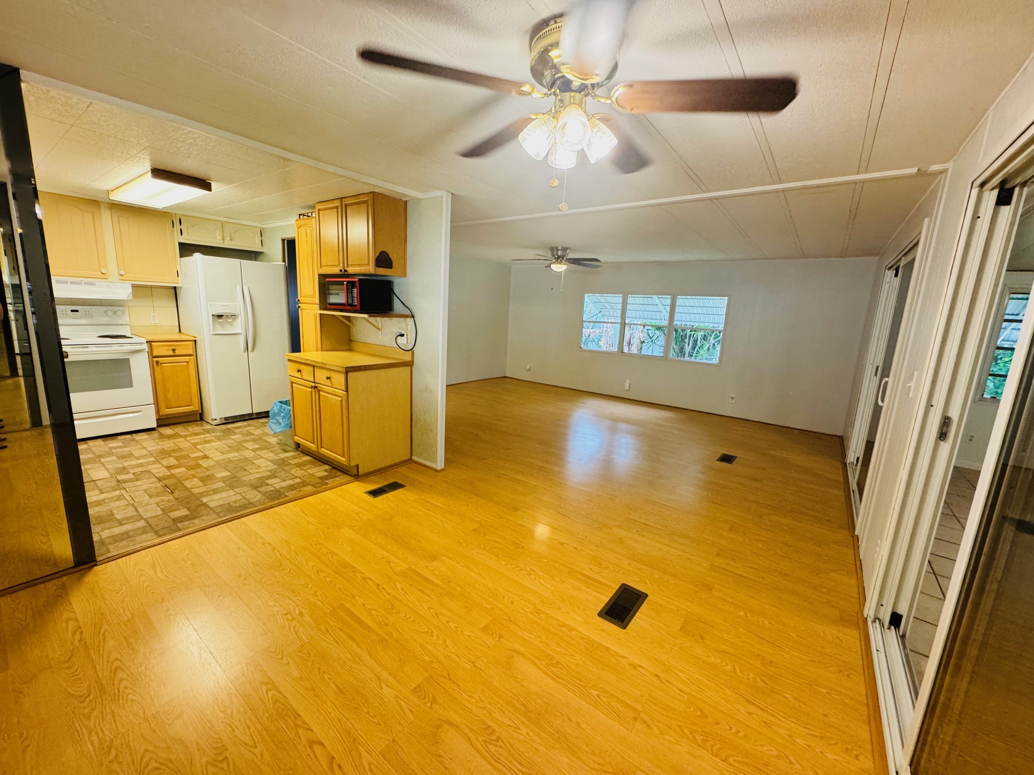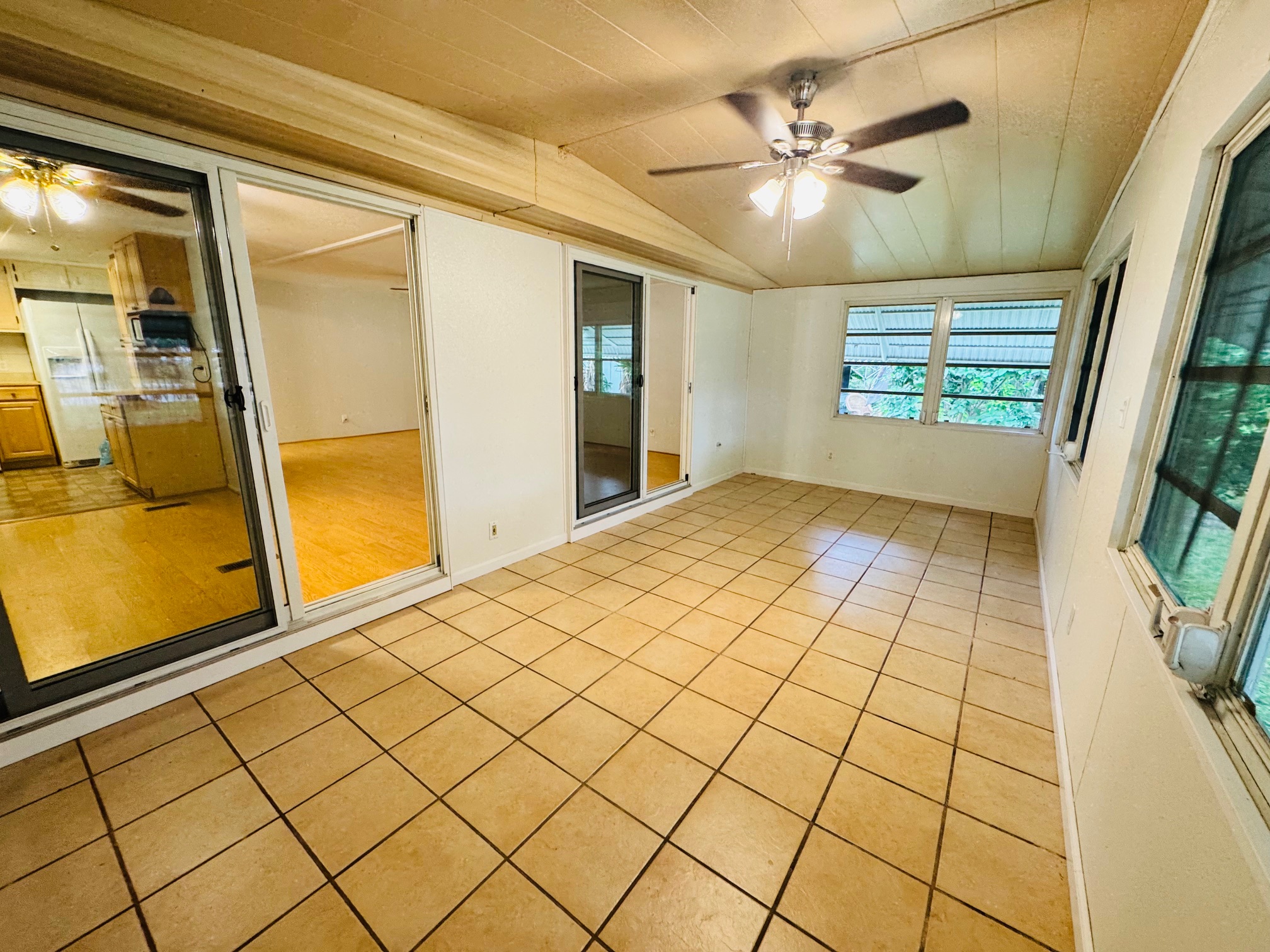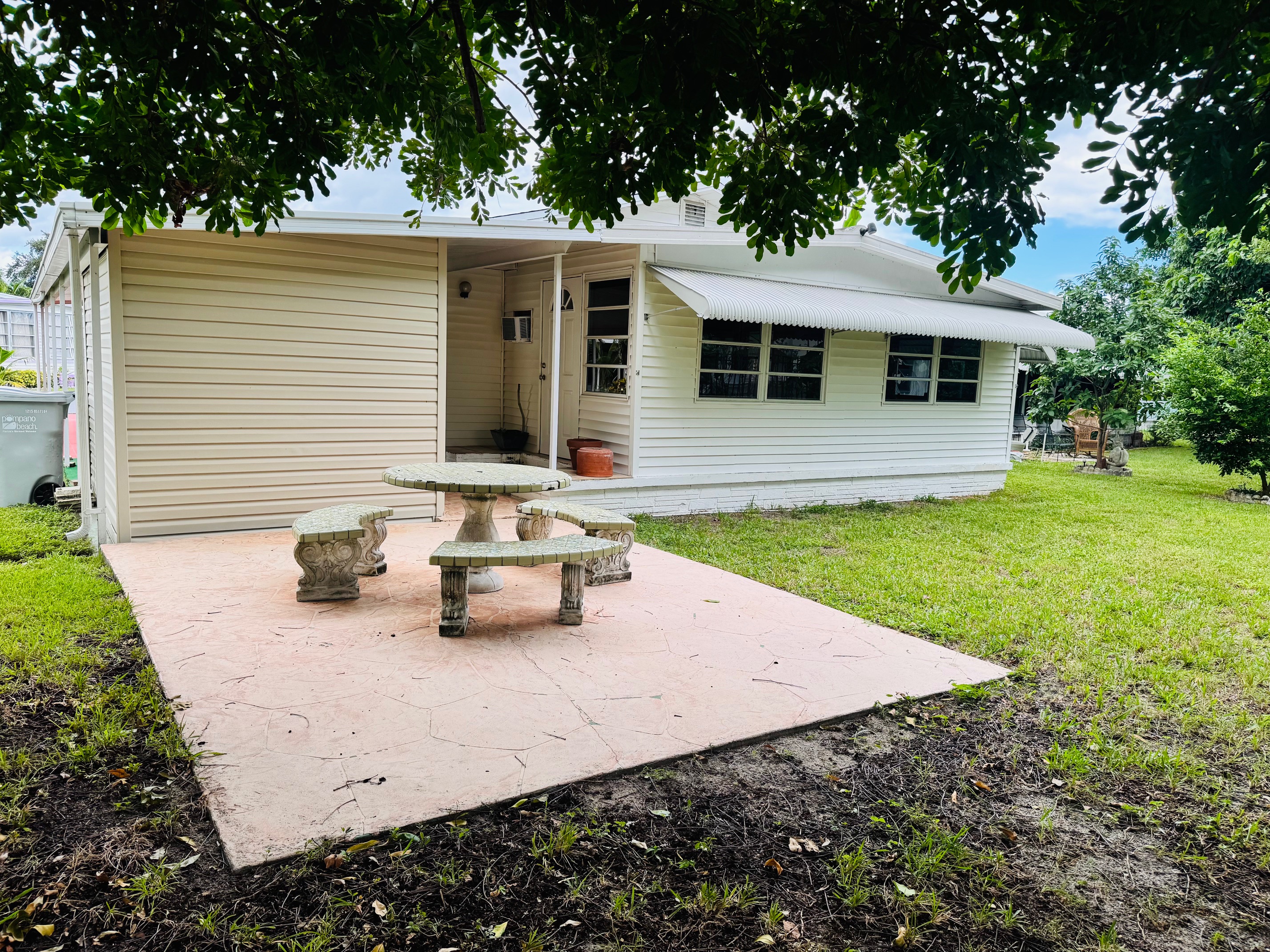 2/2 Double wide, Freshly painted throughout walls and ceilings, this spacious open floor plan offers a modern feel from the moment you walk in. Enjoy updated bathrooms, a brand-new dishwasher, and an upgraded sliding glass door that opens to a spacious Florida room, lovely backyard porch — perfect for entertaining. Durable laminate flooring runs throughout the home, with stylish tile in the bathrooms for easy maintenance. Move-In Ready!